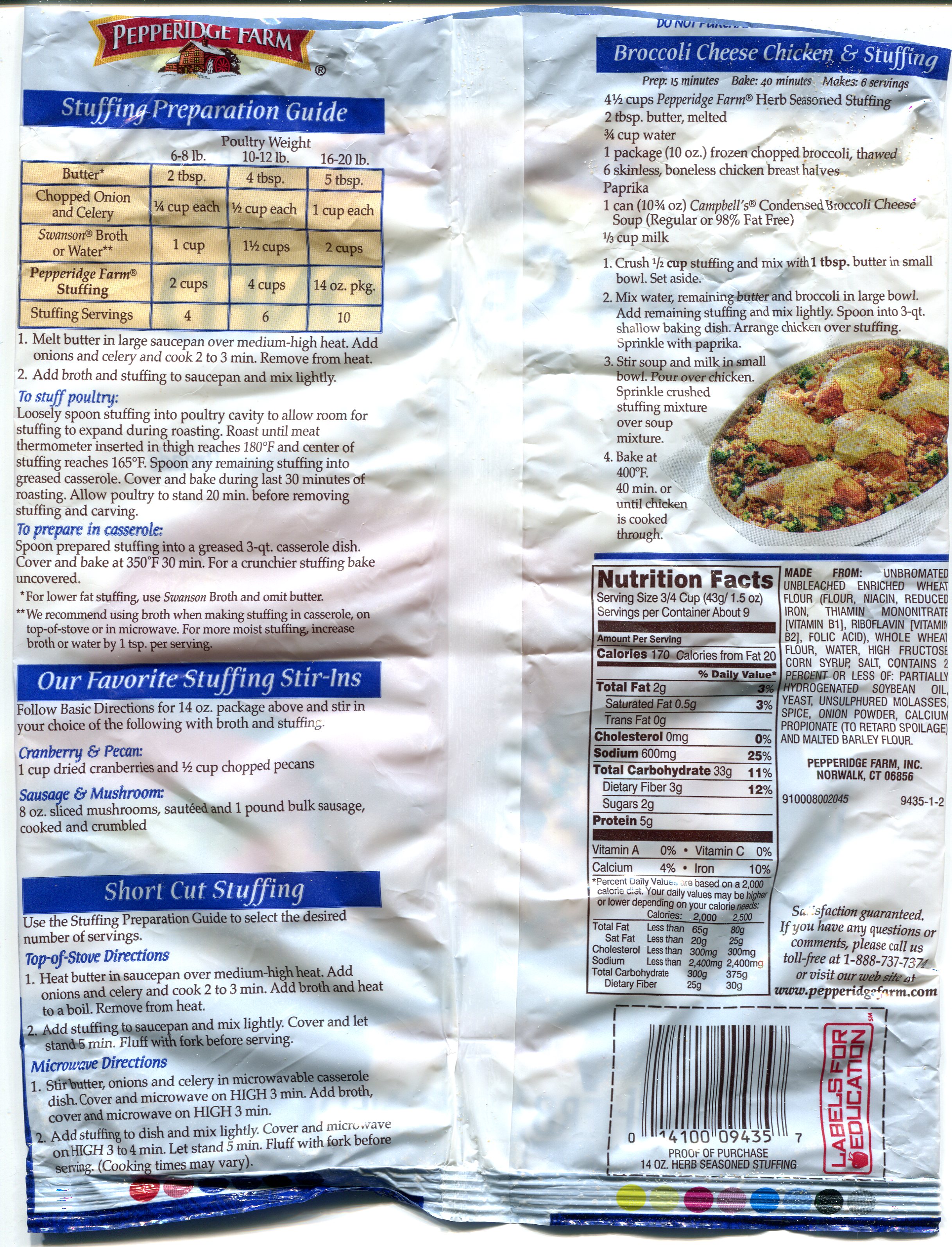 - Pepperidge Farm Stuffing Instructions – for some incomprehensible reason, the most recent bags of stuffing don’t include their classic stuffing instructions.